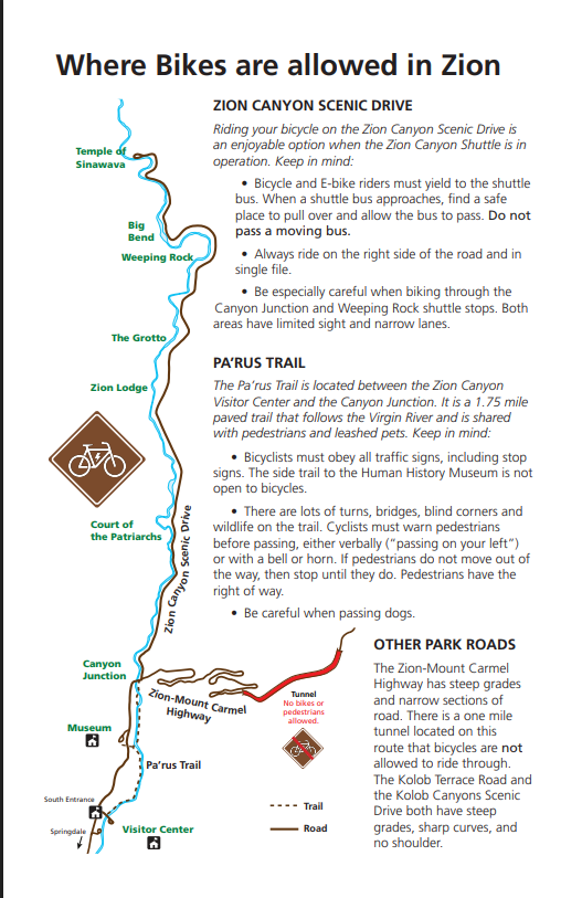 From Springdale, the easiest and most enjoyable way to reach the Narrows trailhead is by bike. Head to the south entrance of Zion National Park, then follow the scenic Pa’rus Trail, which connects directly to the main canyon road. Bikes are allowed on the road, so you can ride all the way up-canyon without waiting for shuttles. It’s about 8 miles to the final stop at the Temple of Sinawava, where you’ll find the start of the Riverside Walk. At the end of this paved trail, you step directly into the Virgin River to begin the Narrows. Riding a bike not only saves time compared to the shuttle but also gives you the freedom to stop at viewpoints along the way..