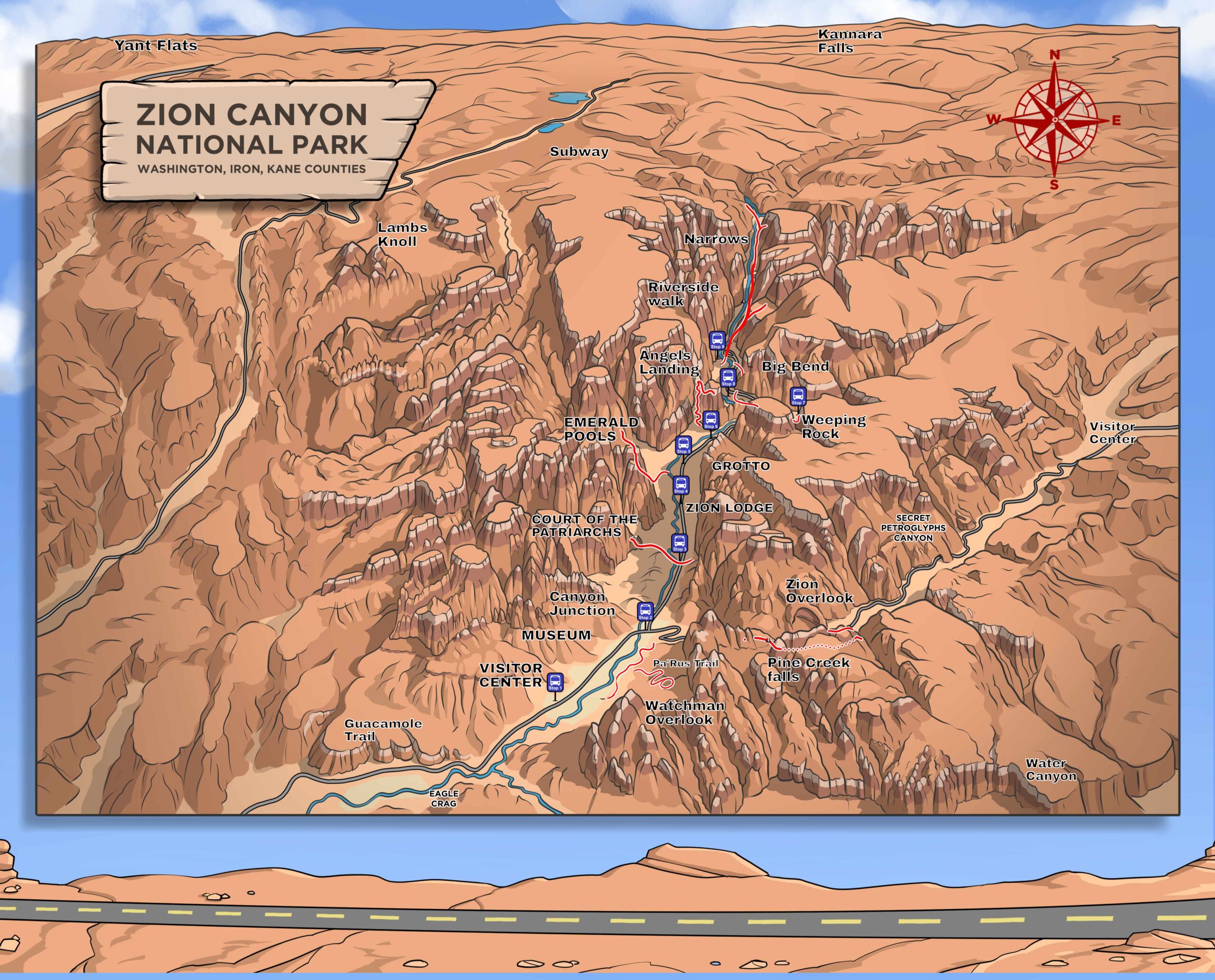 Park Shuttle – stops at all major trailheads: Angels Landing, The Grotto, Emerald Pools, Big Bend, and Temple of Sinawava.